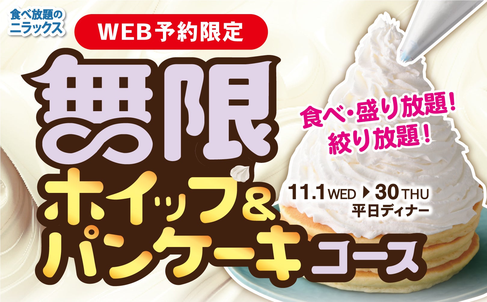【盛り放題‼絞り放題‼ 無限にホイップクリーム&パンケーキ食べ放題‼ 】11/30迄の平日ディナー予約限定!ニラックスブッフェ2店舗にて無限に食べ放題で堪能!『無限ホイップ&パンケーキコース』が登場!