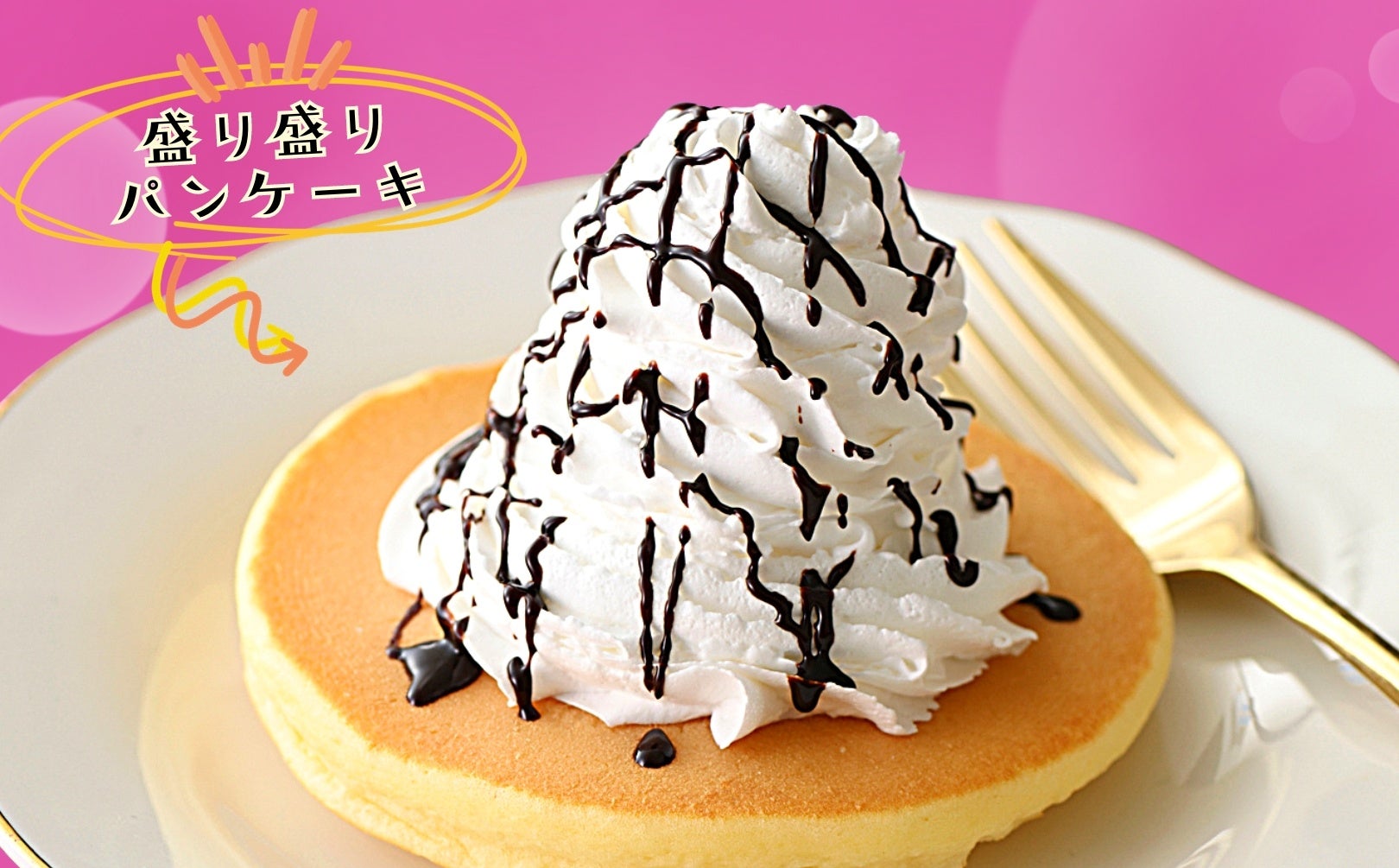 フワッフワ食感!ほんのり優しい甘さの『パンケーキ』に思う存分『山』のように絞れば、映えも確実!『盛り盛りパンケーキ』も楽しめちゃいます!