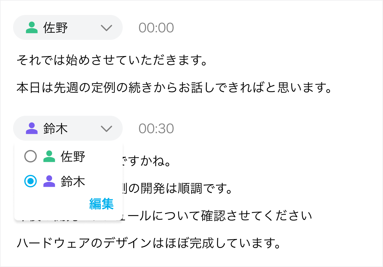 1つのブロックの名前を変更すると、同じ人物と認識したブロックにも変更が反映されます。(自動識別された話者は、「オートメモ Home」でのみ確認できます)
