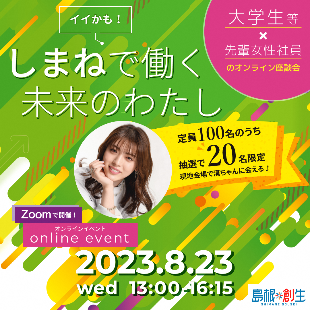 若者の県内就職を促進するため、県内企業でいきいきと自分らしく働く女性社員との交流を通して、県内に多くの魅力的な職場があることを島根県出身の学生に広く伝えることを目的として、オンラインイベント(一部現地参加)を開催します。