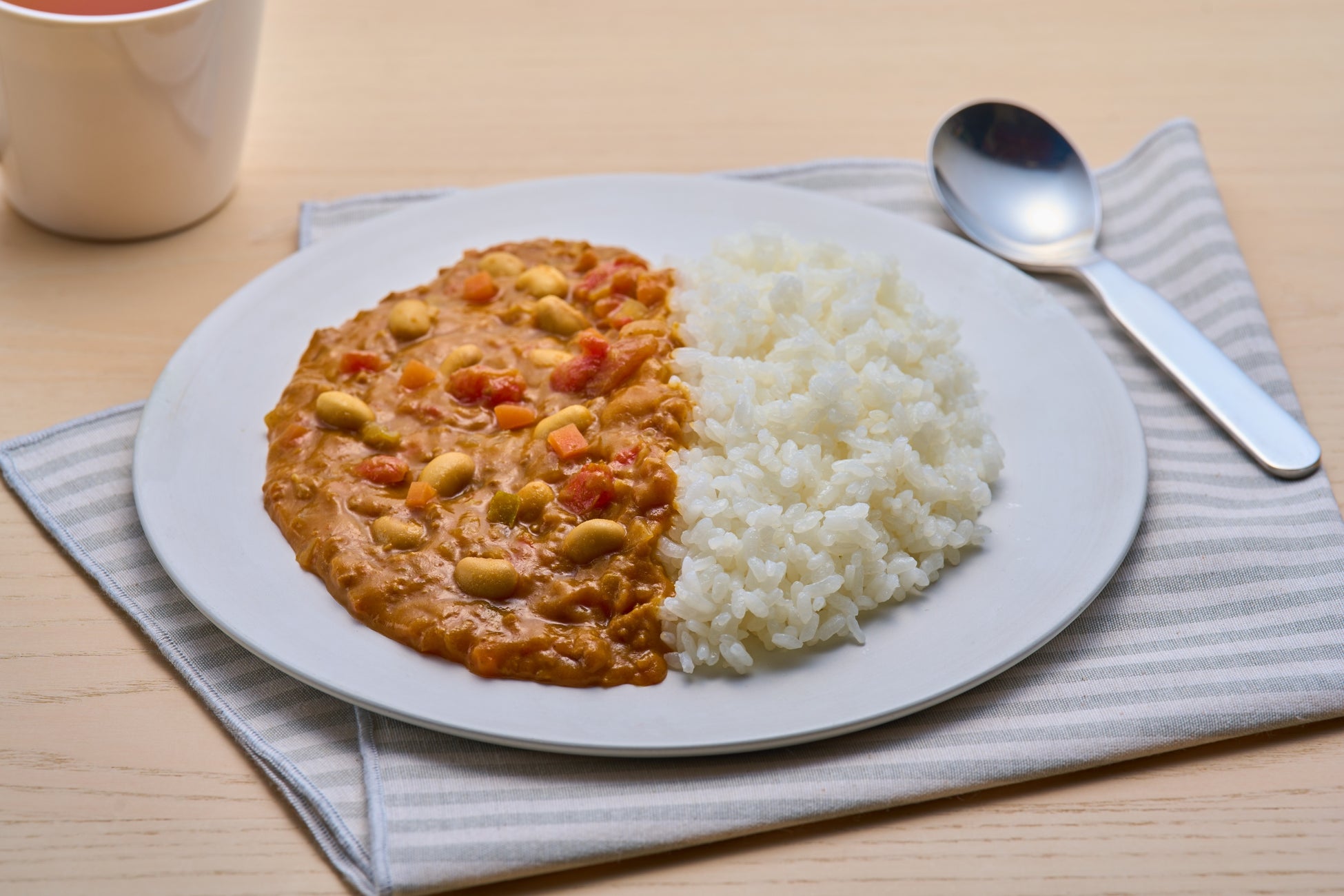ピーマンや大豆を加え、彩り鮮やかに栄養素をプラス。野菜はペースト状にしたものを使用し、野菜が苦手なお子様でも食べやすいように工夫しています。 また、2種類のルウを使用しながらも辛み成分を極力抑え、子どもも安心して食べられるお家で作ったような優しい味のキーマカレーです。
