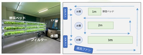 野菜(リーフレタス)を栽培(414株)し、魚(ティラピア)を養殖(9匹)する室内環境で、