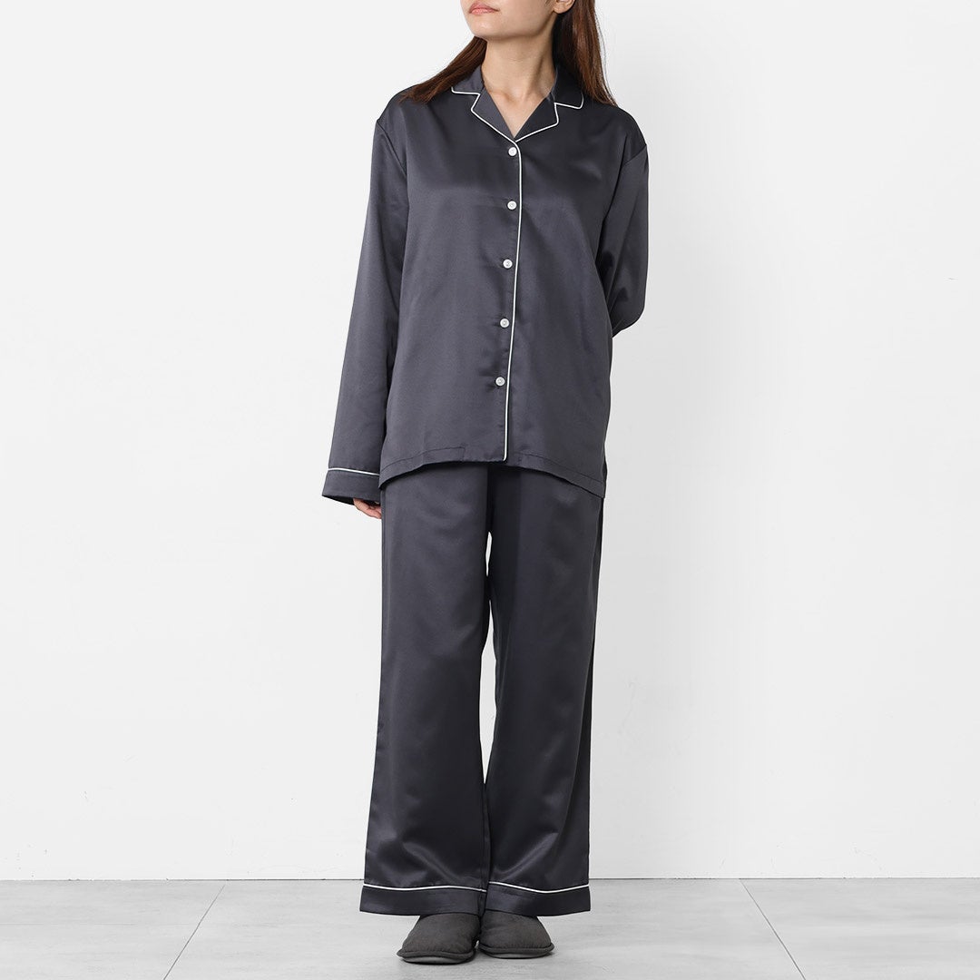 上品な光沢感が魅力のサテン生地を使用した長袖トップスとロングパンツのセットです。肌に触れる裏側は綿で温かくインナー無しでも冷たさがなく優しい肌触りです。汗も吸ってくれるので蒸れにくく快適です。