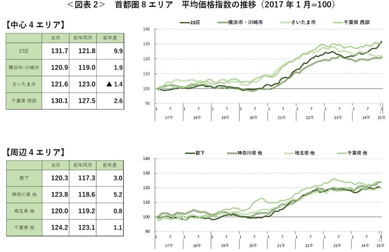 なお、東京23区は6カ月連続で2017年1月以降最高額となった。特に直近2カ月の前月比上昇率は1%台後半と高く、平均価格指数は131.7と千葉県西部を抜いて全8エリアで最も高くなった。