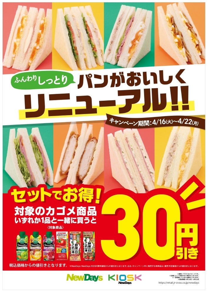4月16日(火)から4月22日(月)までの期間、サンドイッチいずれか1品と対象のカゴメ商品いずれか1品を一緒にご購入いただくと30円引きいたします。