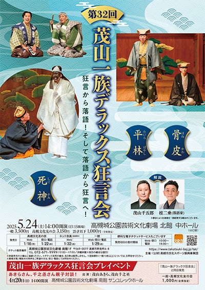 令和7年5月24日(土曜日)、高槻城公園芸術文化劇場で狂言大蔵流の名門「茂山千五郎家」が集結する「第32回 茂山一族デラックス狂言会」が開催。「落語と狂言」をテーマに「平林」「死神」「骨皮」の3作を上演し、狂言の魅力を観客の皆さまに存分にお楽しみいただきます。