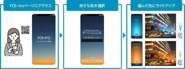 街演出クラウドサービス「YOI-en」と次世代照明「LANTERNA」を活用した、来訪者のスマートフォンから照明演出を変えることができる「YOI-iro」。建物、公園、遊歩道などのライトアップが来訪者とのコミュニケーションツールとなり、持続的な賑わいを創出します。LANTERNAが情報のタッチポイントとなり、 空間照明演出に参加できるYOI-iroを体験することができます。