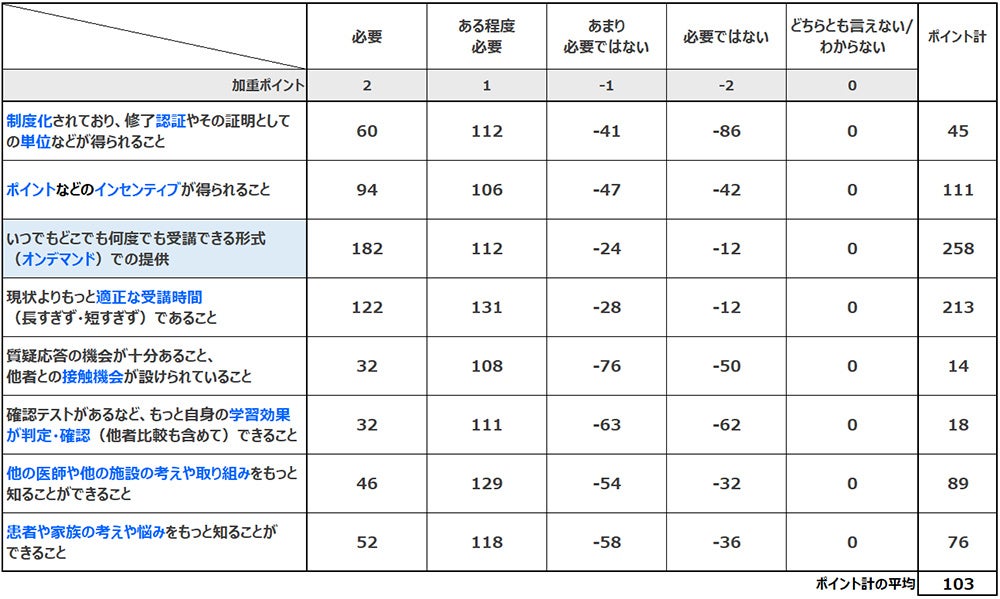 プログラムの配信については、「いつでもどこでも何度でも受講できる形式(オンデマンド)での提供」を求める声が多く、リアルタイム配信プログラムが多いと思われる現状に対して不便さを感じている医師の実態がうかがい知れた。