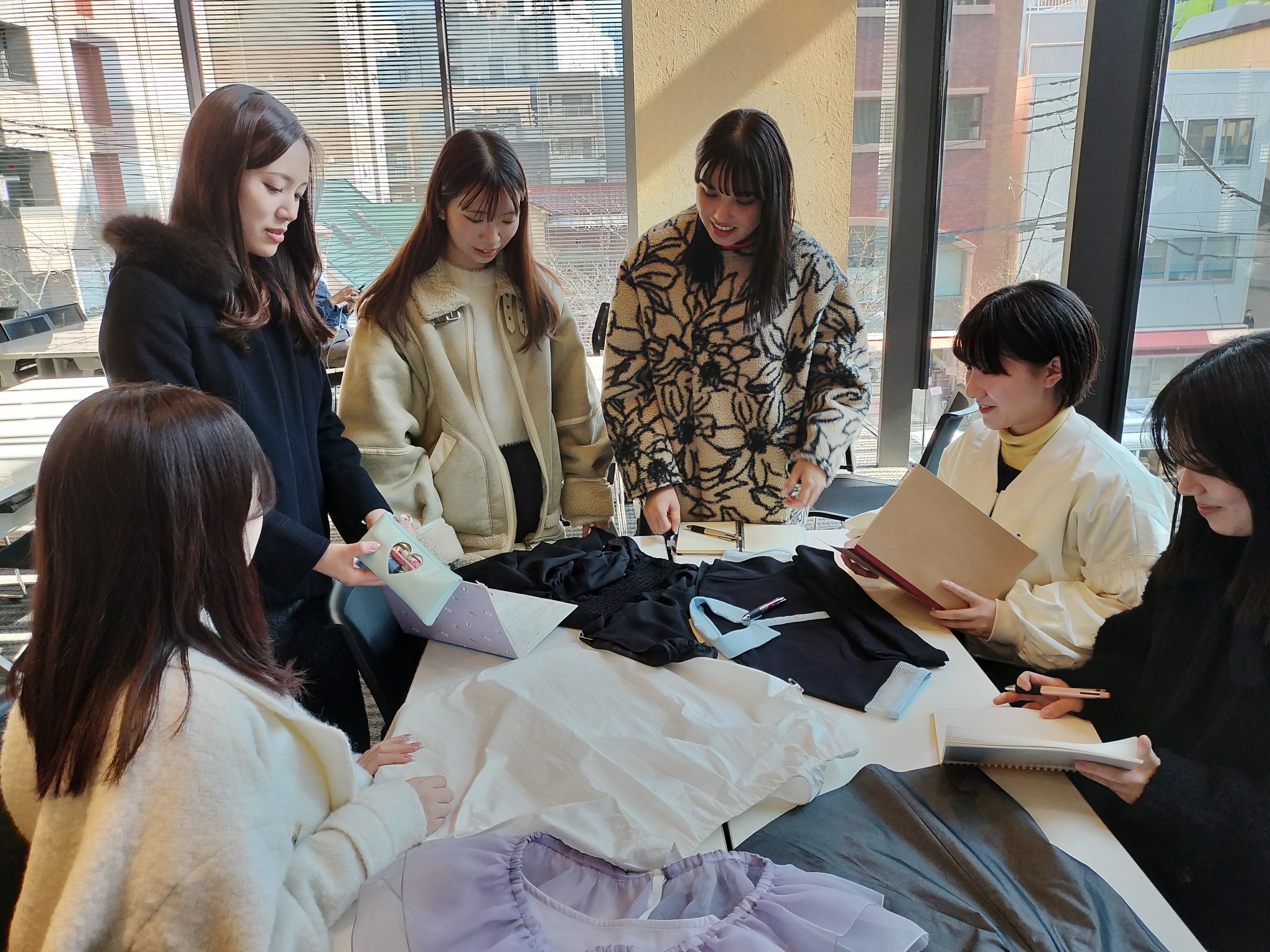 「m_r tokyo (マール トウキョウ)」のプロジェクトに取り組むゼミ学生は、およそ1年前から同世代の女性のニーズを調査した上で、コンセプトを立てて商品企画案を作り、様々な企業の方々と商品開発を進めてきました。デザインの検討、使用素材の検討、縫製仕様書の作成、サンプルの製作、販売価格面の検討、販売計画の立案、そして販売促進計画を進めてきました。多くの課題に直面しながらも、企業の方々の協力によって乗り越え、自分たちが思い描くサステナブルファッションを完成させました。
