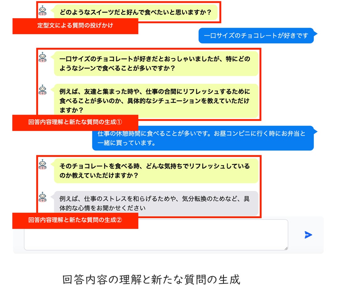 パーソナルインタラクティブとは、モニターひとり一人のコンテキスト(=背景)に最適化された会話の提供であり、具体的には、AIによる「回答内容の理解」「回答内容に応じた自然な質問の生成」を可能にしました。
