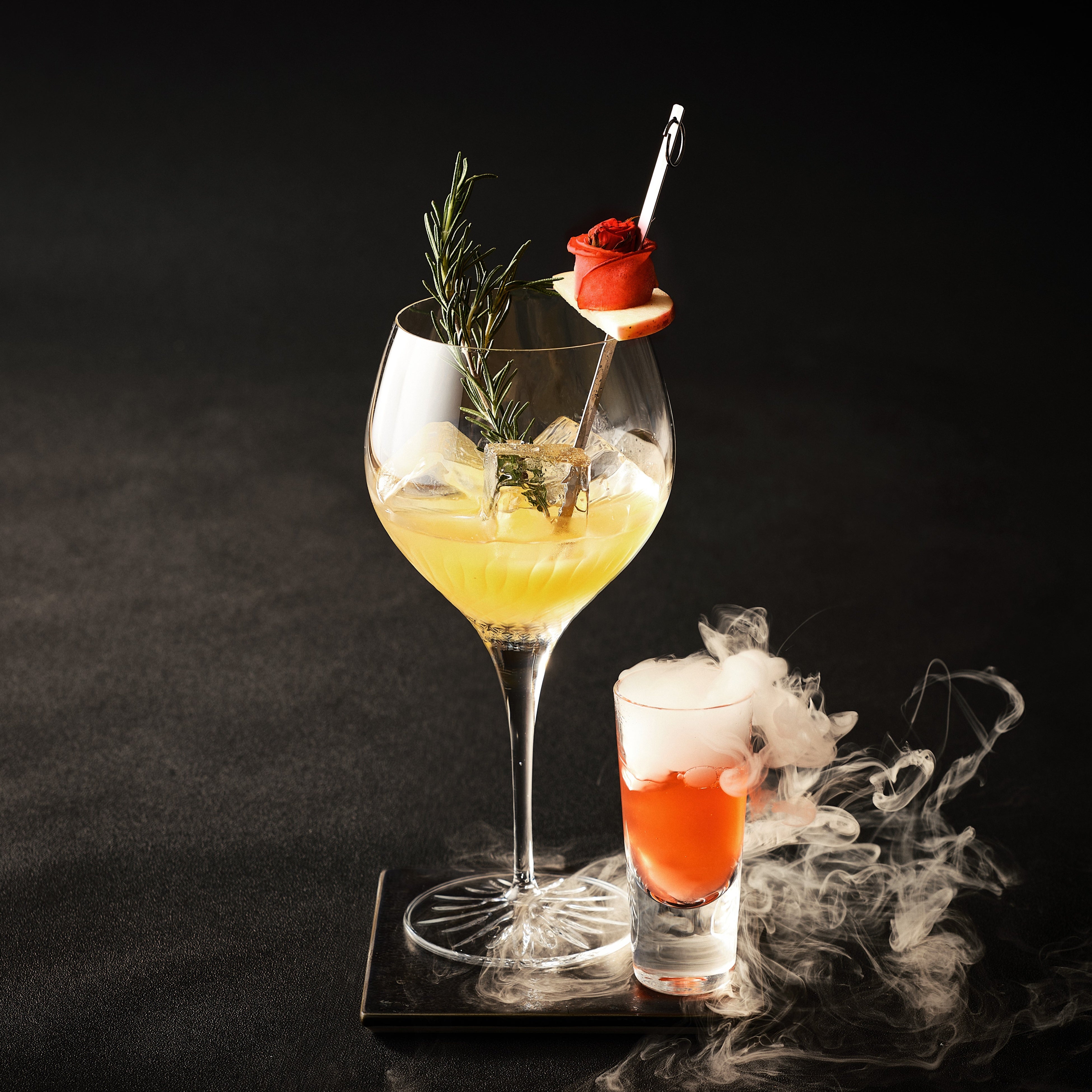 アップル ブランデー オン ザ ロックス オード パルファムからインスパイアされたカクテルは、フレグランスの持つブランデーの芳醇な香りと艶やかなリンゴの果実をイメージ。アップル ブランデーにカルヴァドス、アマレット、リンゴジュース、清涼感を表現したライムジュース、ラ・フランスジュース、クランベリージュースの組み合わせが、クールでモダンな香りを表現しています。