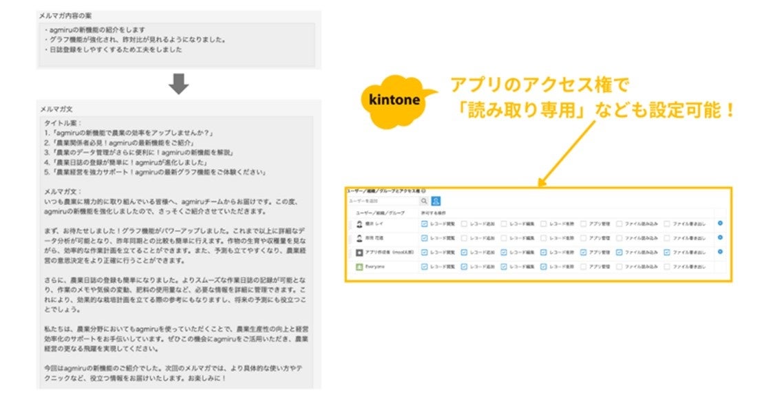 メルマガに記載したい内容の概要を入力するだけで、タイトル案から本文案までを作成するアプリです。kintoneの標準機能を利用し、マーケティング担当のみ閲覧・使用許可といった制限をかけることもできます。