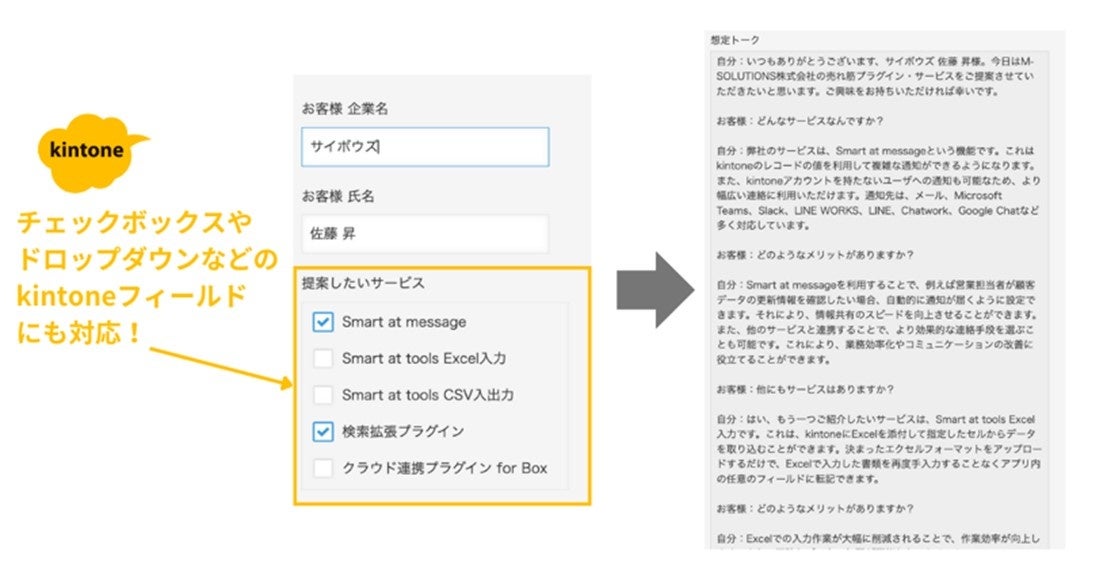 提案先企業名、お客様氏名、自社製品情報を入力・チェックするだけで、セールストークスクリプトを作成するアプリです。自社製品が複数ある場合、kintoneのチェックボックスを使用し、プロンプトに挿入することも可能です。