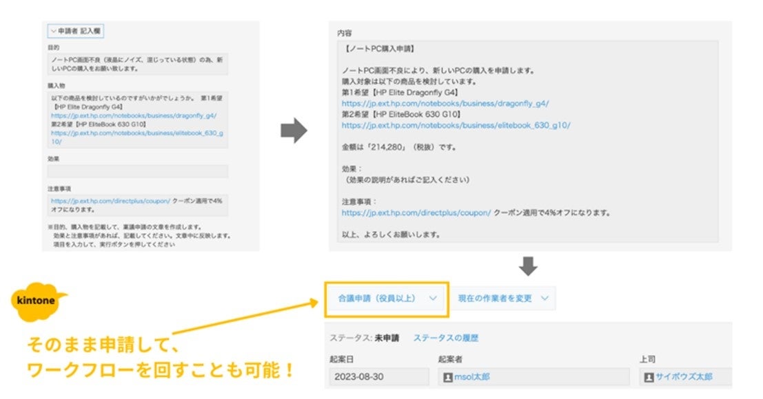 kintoneのプロセス管理機能を使うことにより、そのまま稟議申請のワークフローを作成可能です。