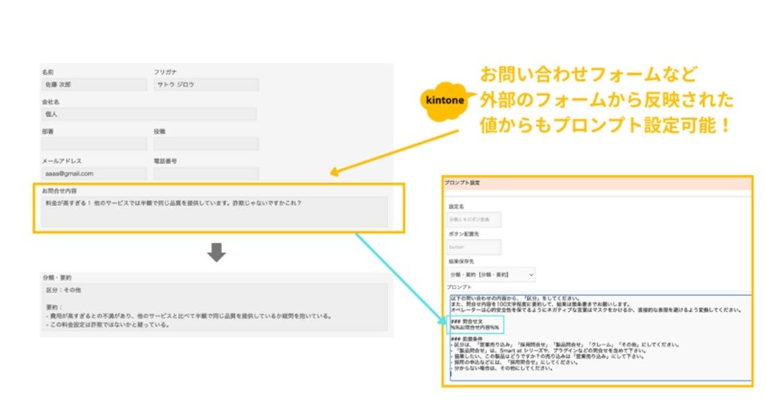 お問い合わせ内容を自動で分類・要約するアプリです。お問い合わせフォームからkintoneへ自動で反映した情報を、そのままプロンプトに挿入することも可能です。お問い合わせ内容を分類・要約すれば一覧画面で完結に内容を確認できるため、対応への優先順位付けなどにお役立ていただけます。