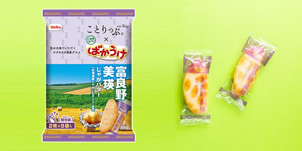 今回のコラボ商品は、「ご当地ばかうけ じゃがバター」、「ご当地ばかうけ うまくち醤油仕立ての甘えび」、「ご当地ばかうけ 辛子明太子」、「ご当地ばかうけ 紫いもと黒糖」の4品にての展開となります。