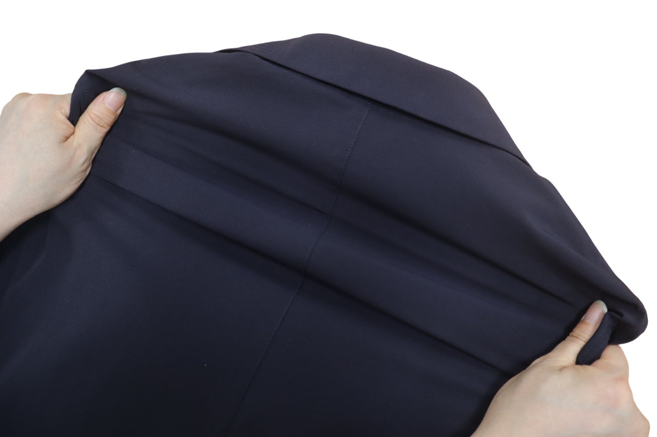 今回の発売するセットアップの生地は、縦方向に約30%、横方向に約25%伸びるスポーツウエアに使用されるほどのストレッチ性と、汗を素早く吸収し生地表面へ移動・拡散する優れた吸汗速乾性が特長です。ジャケットは、機能性素材でありながらもビジネスシーンを想定し、ハリのある生地を採用したことに加え、胸ポケットやフラップポケットを設計することできちんと感を演出しています。パンツは、前回同様ウエストをゴム設計にし、座った時の圧迫感を軽減。股下部分にはひし型状のマチを作り生地が突っ張らないガゼットクロッチ仕様にするなど、スポーツ機能とビジネスを融合した商品となっています。
