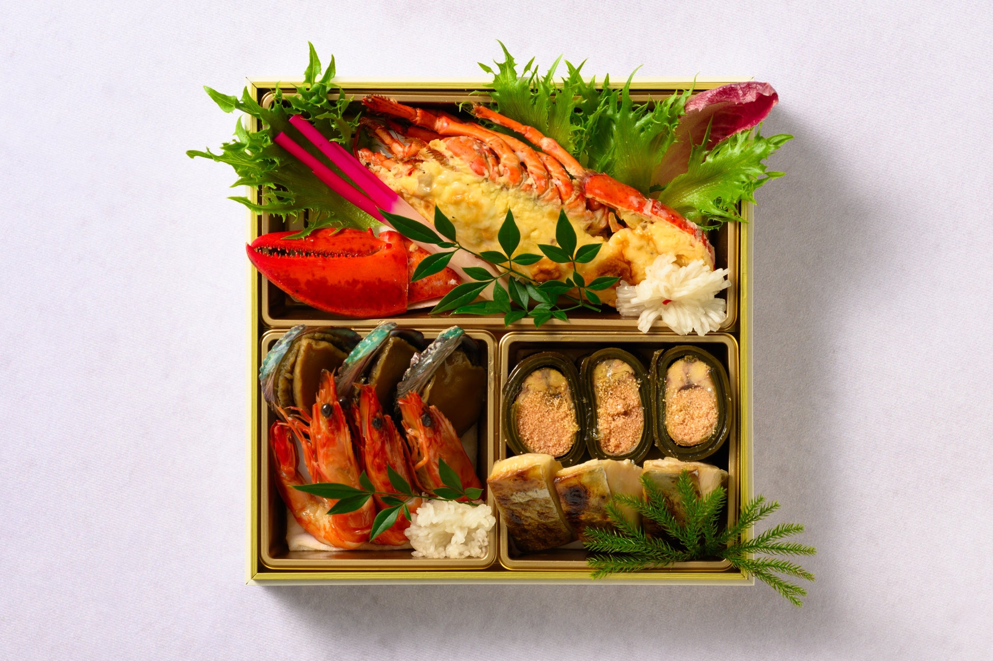 オマール海老のグラタン仕立て/鮑煮貝/海老旨煮/鰆西京焼き/子持ち鮎昆布巻き/梅ちらし 青串