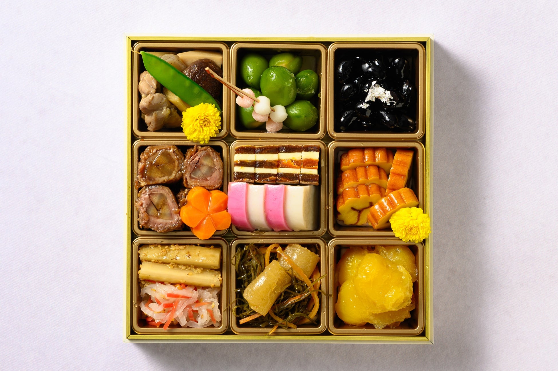 煮しめ/飛騨牛八幡巻き/紅白なます/たたきごぼう/数の子松前/柿バター博多押し/紅白かまぼこ/丹波ぶどう豆 赤ワイン味/若桃甘露煮/メープル香る伊達巻/栗きんとん