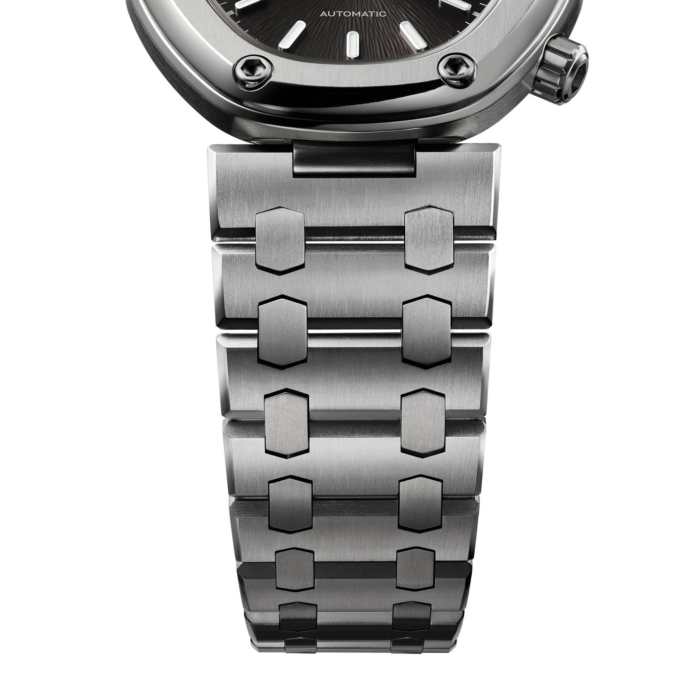 ブレスレットも「Locomotive」たる重要なデザイン要素の1つです。中留側に向かって、細部まで丁寧に作りこまれたテーパー駒や、六角形の中駒が特徴です。高度な技術で作られたブライトチタンのブレスレットは、快適な装着感と高い耐久性を備えています。