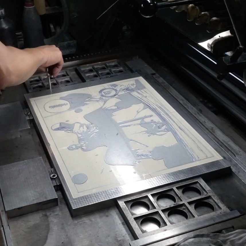 「The Press」と名づけたシリーズ。モノクロの物語表現として発展したマンガの起源に立ち返り、現在では希少となった活版平台印刷機を用いて、A2 (594 x 420mm)サイズのグムンドコットン・マックスホワイトに、強い印圧で「プレス」しています。印刷面が沈む、独特な表面。プリント作品はもちろん、印刷機と技術を次世代に継承していくことも目的にしています。