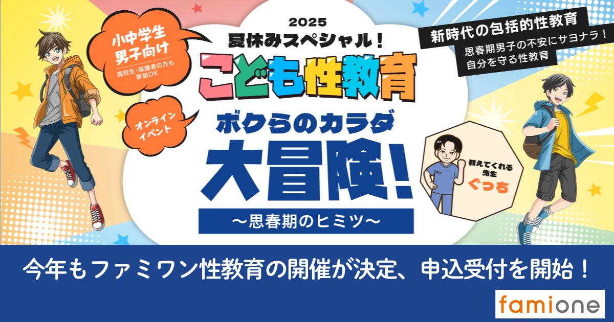 「子どもを願うすべての人によりそい 幸せな人生を歩める社会をつくる」をビジョンに掲げ、法人の従業員向け福利厚生や自治体の住民向け支援を行うヘルスケアサポートサービス「ファミワン」 https://famione.com/benefit/などを展開する株式会社ファミワン(本社:東京都渋谷区、代表取締役:石川勇介)は、オンラインイベント、「夏休みスペシャル!こども性教育2025 ボクらのカラダ大冒険!~思春期のヒミツ~」を開催します。