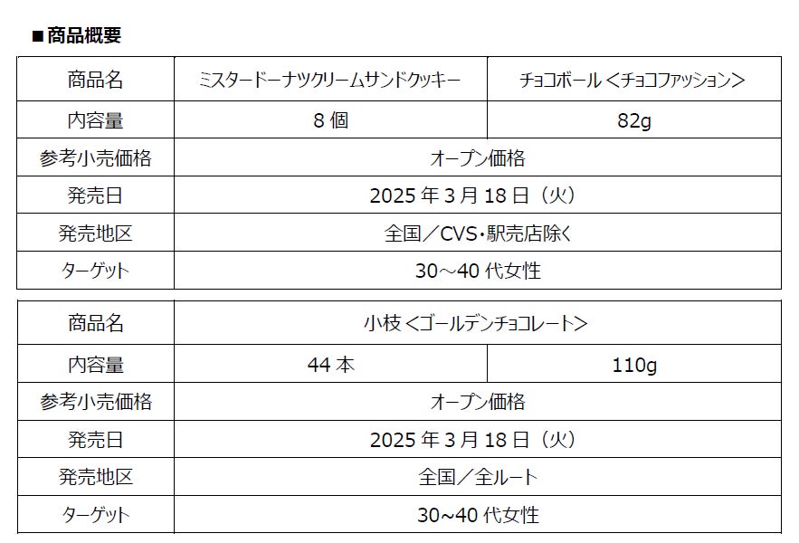 『エンゼルクリーム』をイメージした「ミスタードーナツ クリームサンドクッキー」、『ゴールデンチョコレート』をイメージした「小枝<ゴールデンチョコレート>」、『チョコファッション』をイメージした「チョコボール<チョコファッション>」が登場します。ドーナツの揚げた風味にまでこだわった味わいや食感の再現性、美味しさをドーナツと食べ比べても楽しめる商品です。
