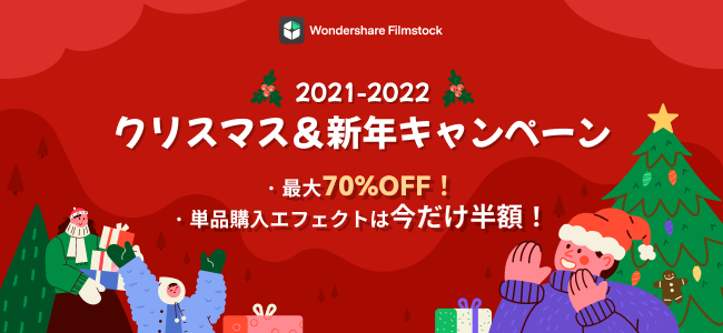 世界150か国以上で利用されるソフトウェアを手掛ける、株式会社ワンダーシェアーソフトウェア(東京都千代田区、代表:呉太兵)は、手軽にクオリティの高い動画が作れる動画編集ソフトWondershare Filmora(ワンダーシェアーフィモーラ)に使える素材サイトWondershare Filmstock(ワンダーシェアーフィルムストック)で、2021年12月21日(火)から2021年12月28日(火)まで、対象エフェクトが最大70%OFFでご購入いただける「Wondershare Filmstock クリスマスキャンペーン」を実施いたします。