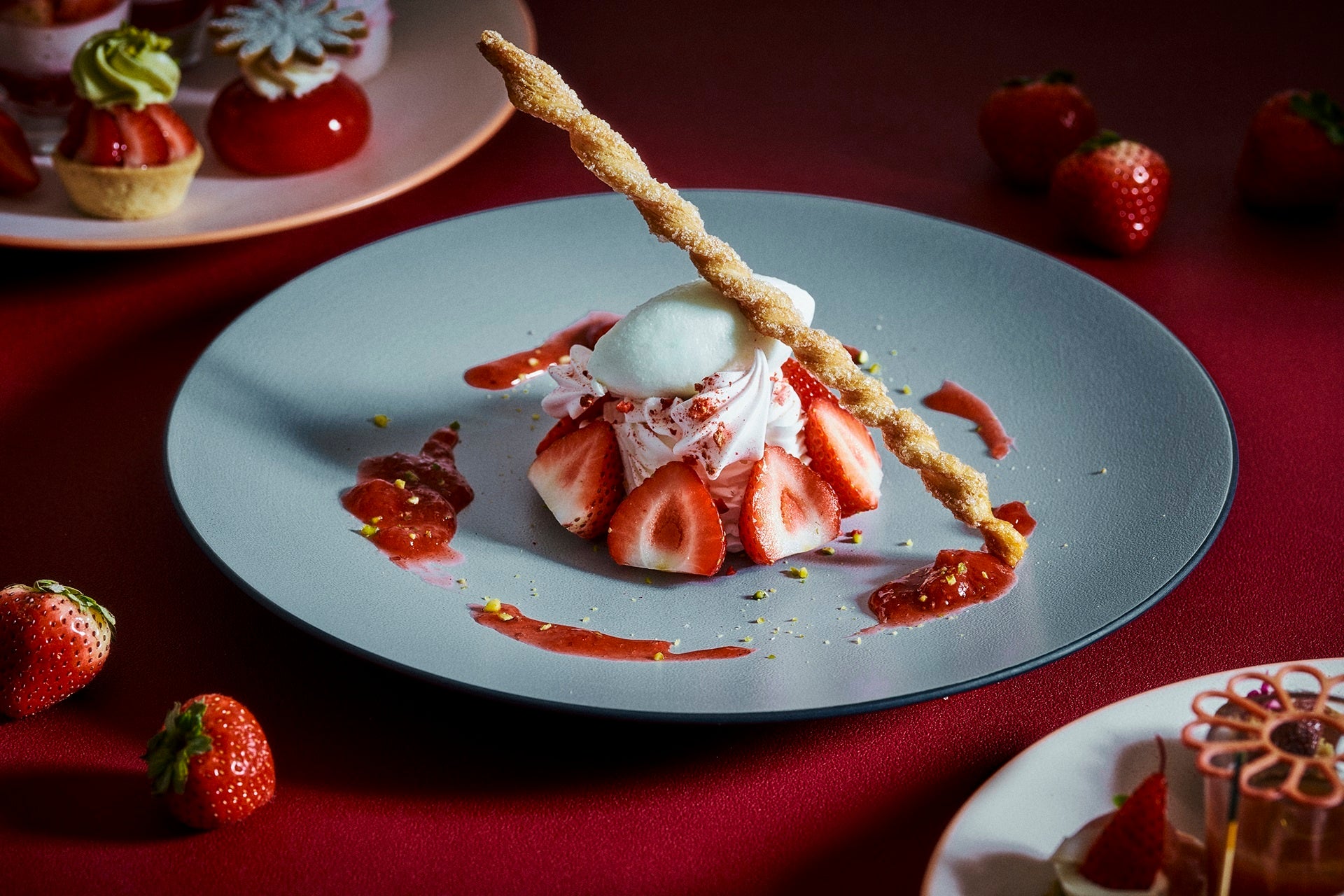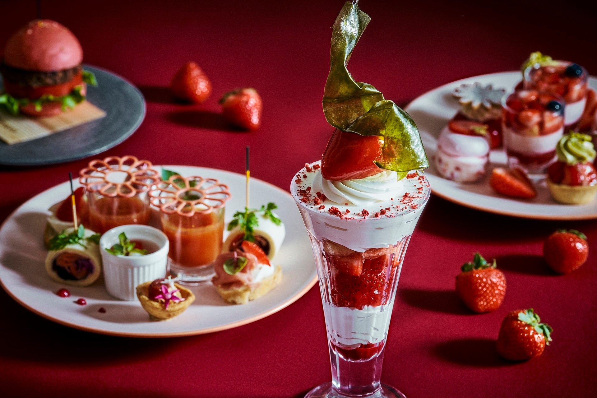 苺の瑞々しさと艶やかさを引き立てる盛り付けを施したメインとなるグランデセールのほか、宝石やドレスを思わせる繊細な美しさを纏った一皿一皿と、シーズナルティーとのペアリング。コース仕立てで提供する当ホテルのアフタヌーンティーだからこその演出と、ホテル最上階の洗練された絶景空間が織りなす“甘美な午後のひととき”をお楽しみいただけます。