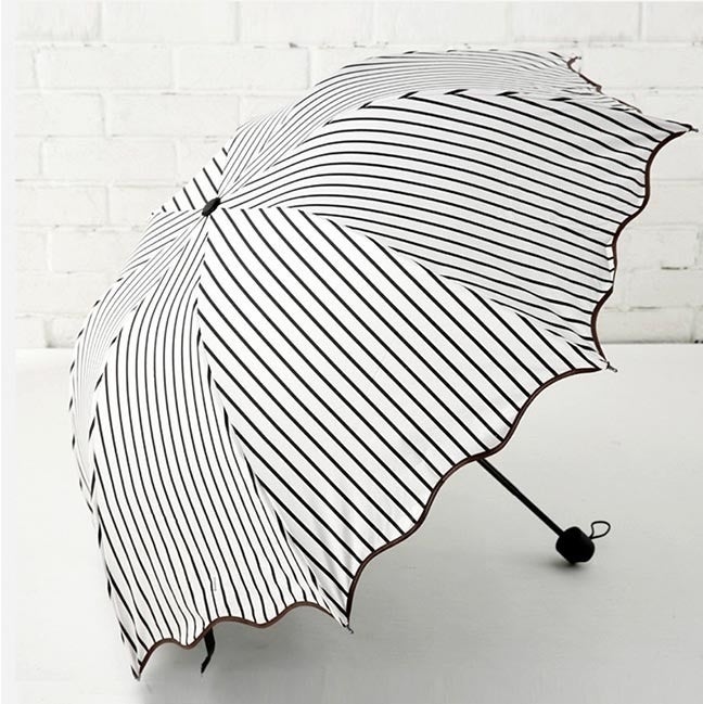 三段折り畳み式で収納しやすく、撥水性・耐風性・遮光性に優れた傘。白地に黒のストライプ柄がレトロ&スタイリッシュ。
