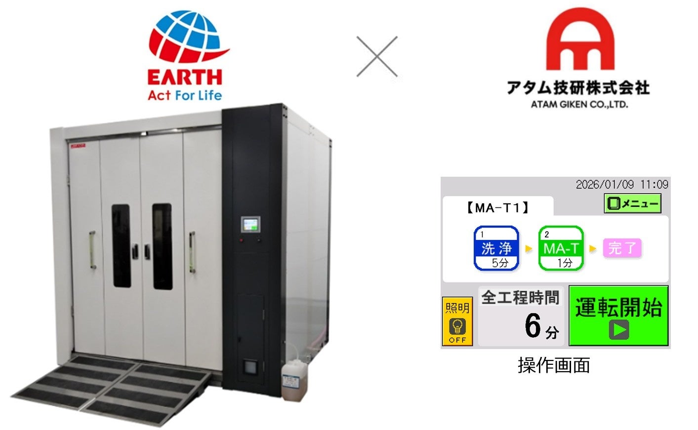 アース製薬株式会社(本社:東京都千代田区、社長:川端克宜、以下 「アース製薬」)は、アタム技研株式会社(本社:愛知県丹羽郡扶桑町、代表取締役会長:井ノ上耀子、以下「アタム技研」)と共同で、車椅子、介護ベッドのパーツ、歩行器などの多品目に対応した福祉用具用多目的洗浄機のすすぎ工程に介護業界で初めて(※1)「MA-T®」を活用した『多目的洗浄機(バッチ式標準機)TS-2501M』を2026年2月下旬の発売を予定しています。