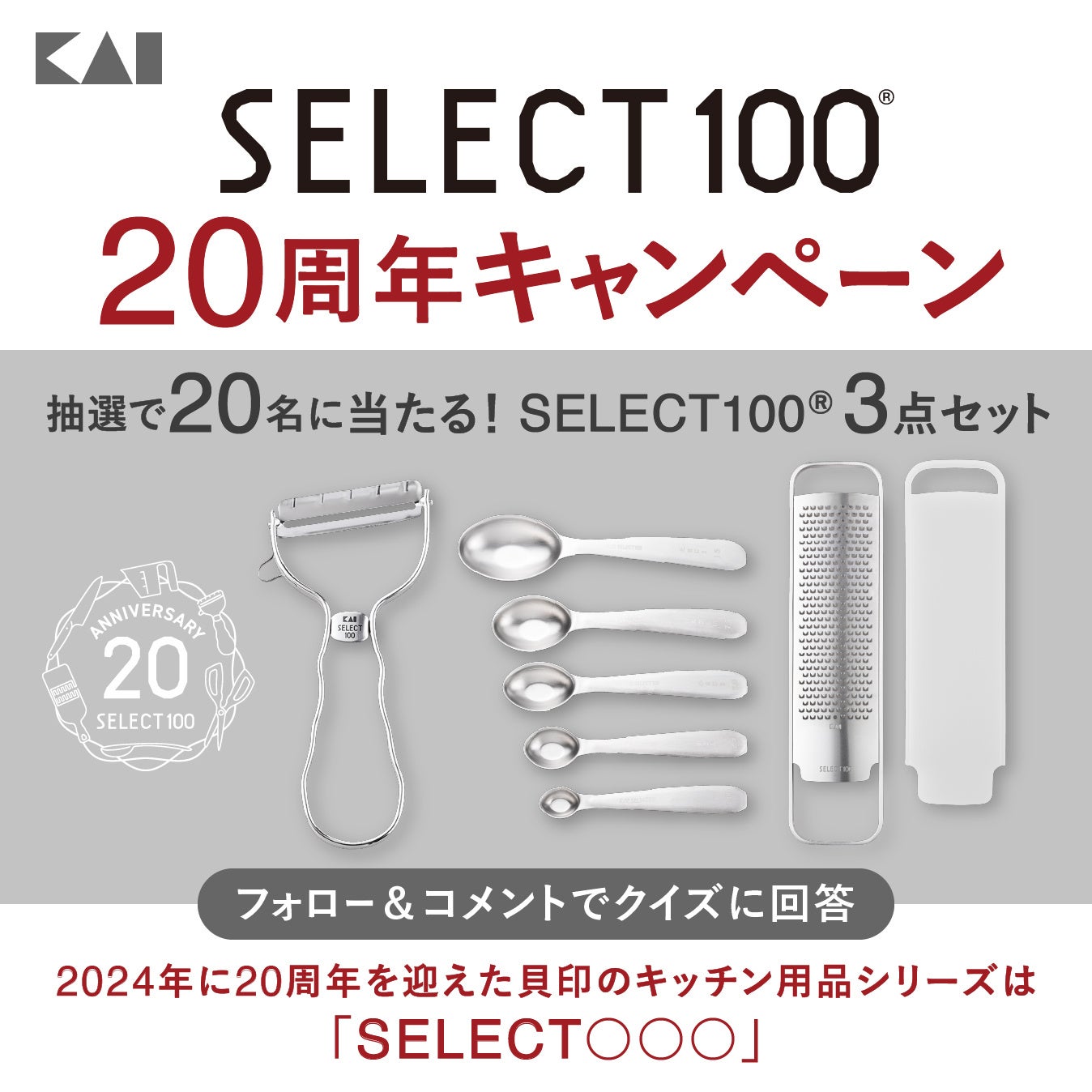 また貝印公式Instagramでは、20周年特別企画としてプレゼントキャンペーンを実施いたします。貝印公式Instagramをフォローし、キャンペーン投稿にコメントすると、20名様にSELECT100詰め合わせ3点セットをプレゼントいたします。