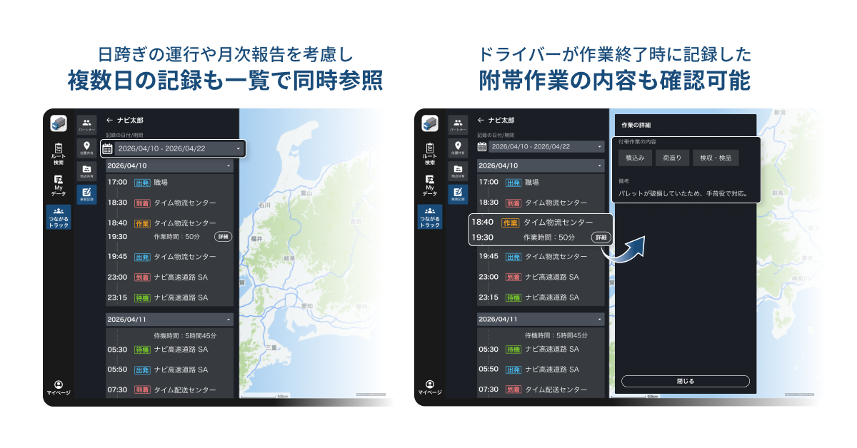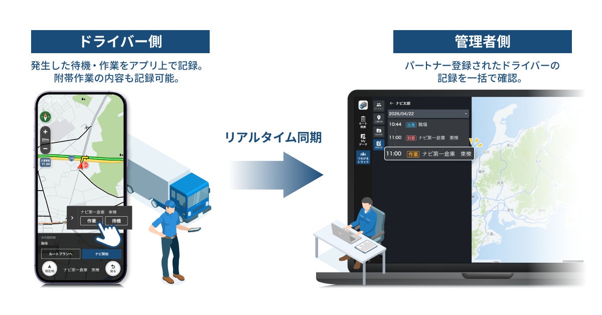 株式会社ナビタイムジャパン(代表取締役社長:大西 啓介、本社:東京都港区)は、トラック専用カーナビアプリ『トラックカーナビ by NAVITIME』にて、2026年4月22日(水)より、ドライバーが待機・作業時間を記録し、管理者がWeb上で確認できる「乗務記録機能」を提供開始いたします。