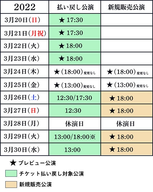 ※3月24日(木)、25日(金)は予定通りプレビュー公演をおこないますため、払い戻し対象外となります。