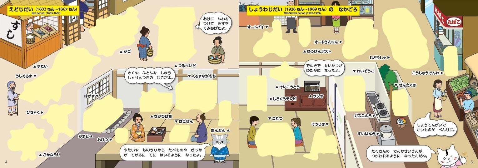 発売された「れきしをまなべるシールブック どうぐとくらし」は、子供たちが、古墳時代、江戸時代、昭和、令和の日本を舞台にした台紙イラストに、それぞれの時代で使われていた道具のシールを貼りながら、タイムトラベルをするように歴史をたどり、暮らしの変化を学べるものです。