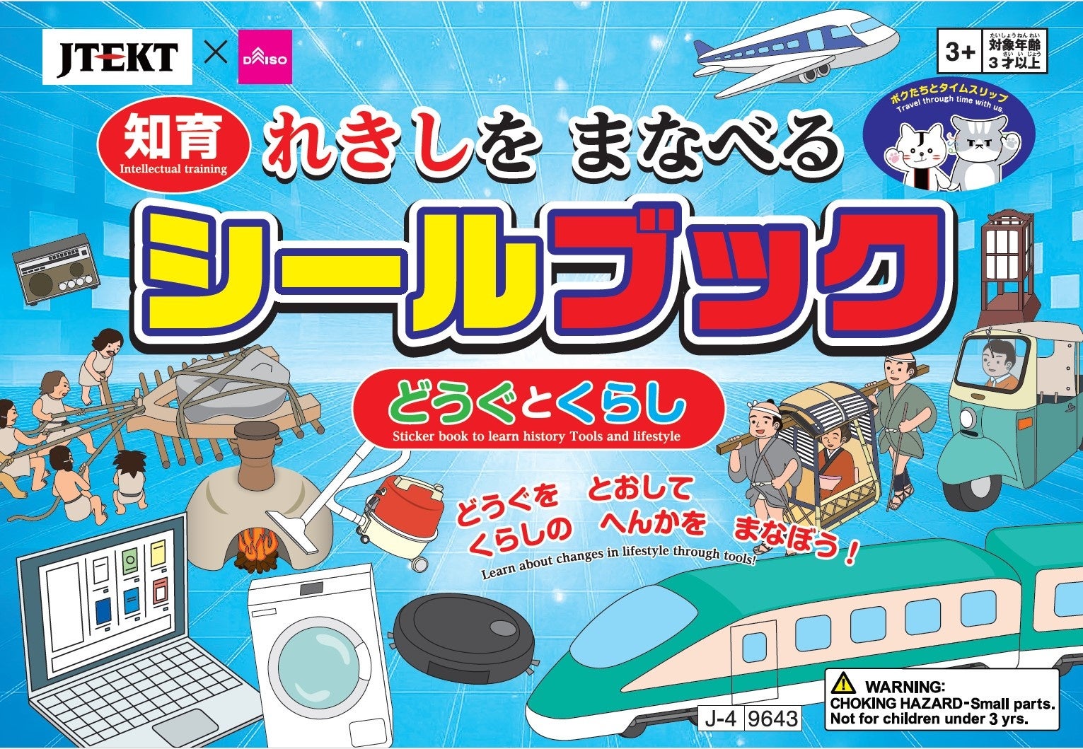 株式会社ジェイテクト(本社:愛知県刈谷市、取締役社長:近藤禎人、以下「ジェイテクト」)は、株式会社大創産業(本社:広島県東広島市、代表取締役社長:矢野靖二、以下「大創産業」)が運営するDAISOにて販売される出版物の制作を担う株式会社大創出版(本社:東京都豊島区、代表取締役社長:西田大、以下、「大創出版」)と共同で「れきしをまなべるシールブック どうぐとくらし」を制作しました。この「れきしをまなべるシールブック」はDAISOの全国の店舗とインターネットストアにて販売されています。
