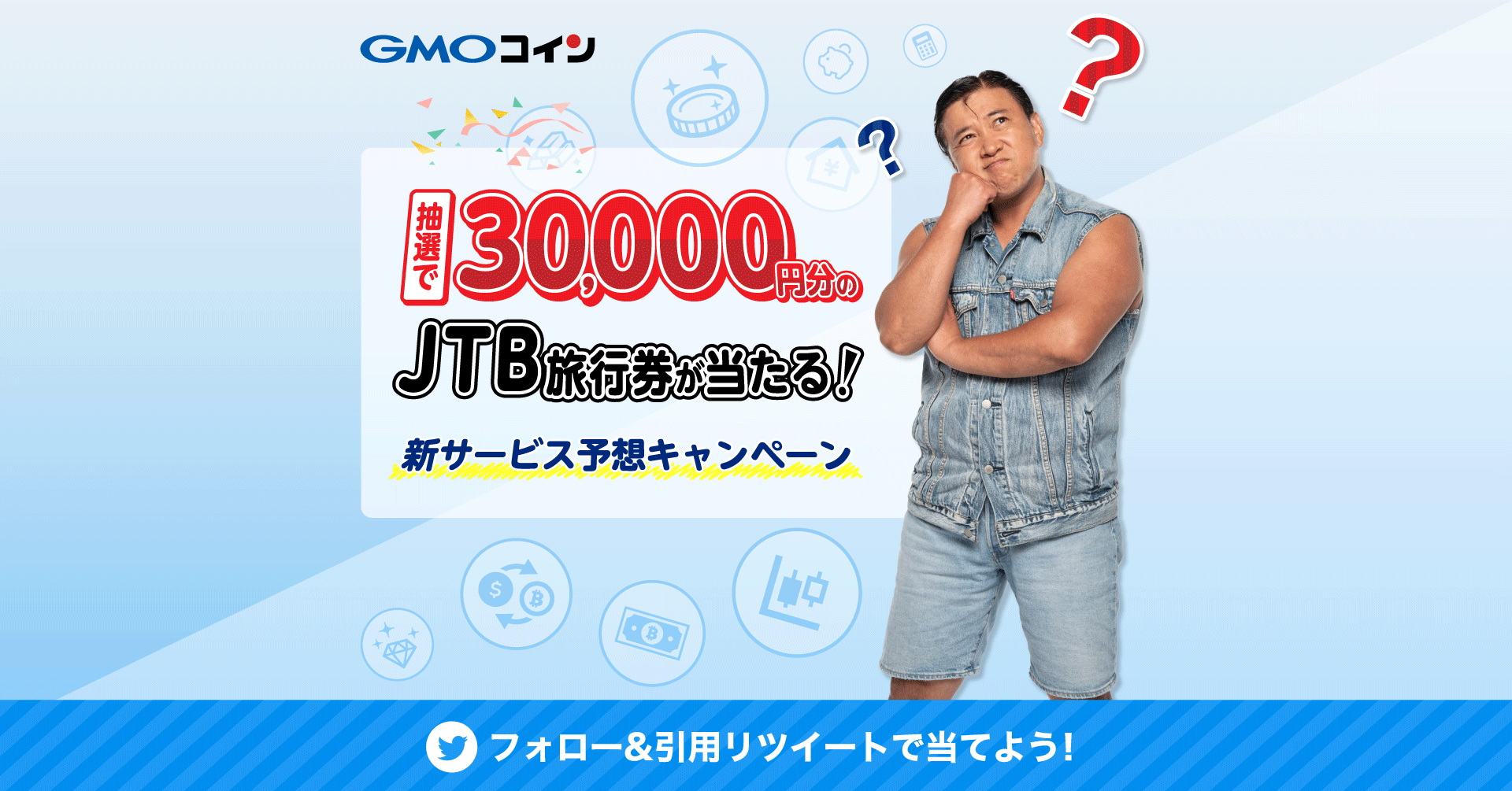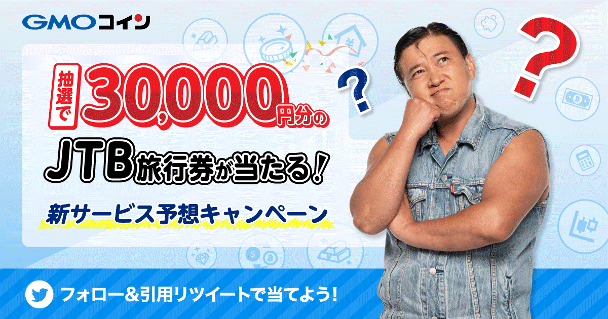 2023年4月にGMOコインが提供を予定している新サービスを予想してJTB旅行券を当てよう!GMOコインの公式Twitterアカウントをフォローして、対象ツイートを引用リツイートして新サービスの予想をした方の中から、抽選で3名様に3万円分のJTB旅行券をプレゼントいたします。予想した新サービスの内容が当たっていなくても、予想するだけでキャンペーンの対象になります。