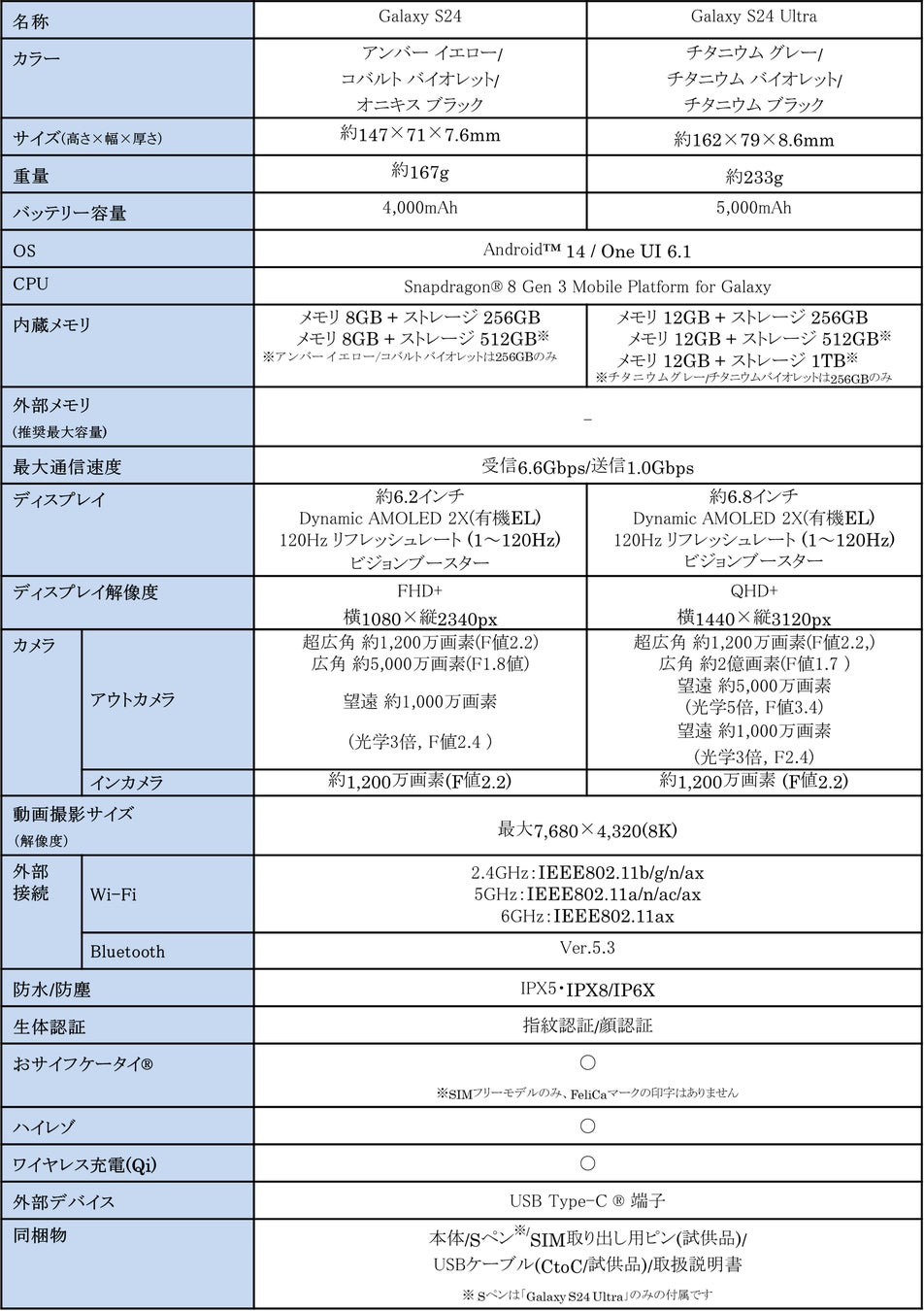 <主な仕様:「Galaxy S24」、「Galaxy S24 Ultra」>