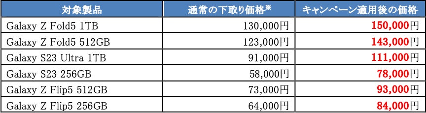 期間中、現在お持ちのGalaxy製品の下取りをお申込みいただきましたお客様に、通常の下取り価格から最大20,000円増額する下取りサービス増額キャンペーンを実施いたします。