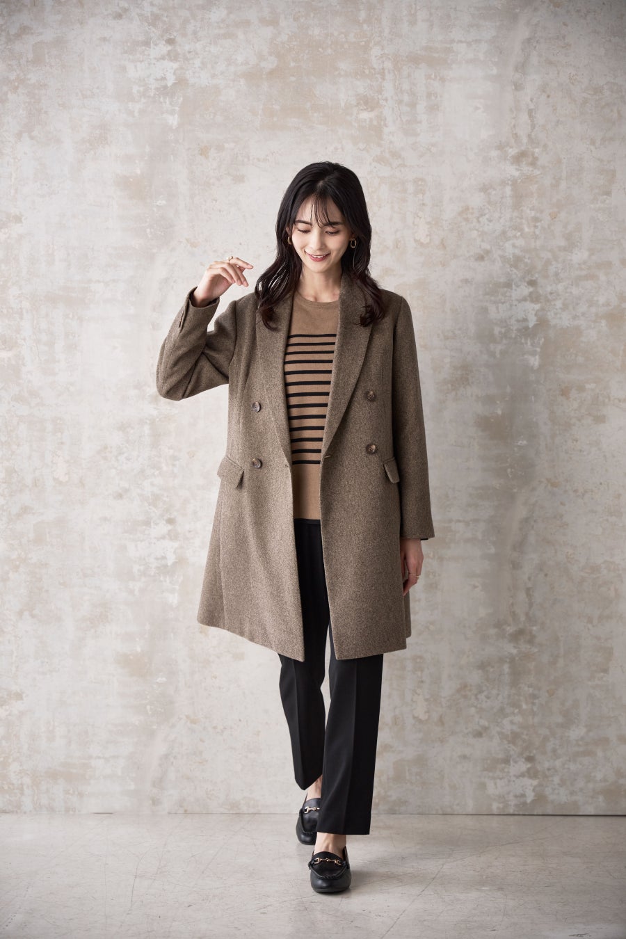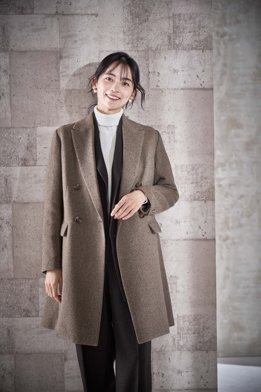 ウール素材を採用した上品さと高級感がある定番チェスターコートはきちんと感をしっかり演出してくれるのでシーンレスに着用可能。ウールの暖かい肌触りと、すっきりしたシルエット、ロング丈でパンツスタイル、スカートスタイル問わずセットアップやスーツと合わせやすいところがポイントです。またスーツスタイルだけでなくきれいめなワンピースなどオケージョンにも活躍する一着となっております。