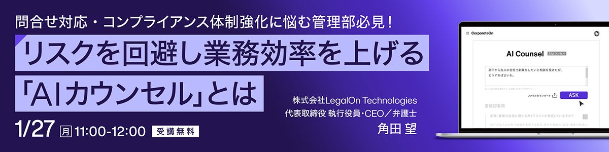 以下の事項につきあらかじめご了承のうえお申込みください。 株式会社LegalOn Technologies(以下「当社」という)と同業他社に所属される方のご参加はご遠慮いただいております。 法律事務所や社会保険労務士事務所に所属される方はご参加いただけます。 講義内容へのご質問は、セミナーお申し込み時点及びセミナー開催時間内に受け付けいたします。セミナーお申し込み時点及びセミナー開催時間内にいただいたご質問であっても、全てのご質問にお答えすることをお約束するものではありません。 お申し込み情報に不備がある場合、参加をお断りさせていただく場合がございます。各項目を正しくご入力の上、お申し込みくださいますようお願いいたします。 本セミナーに関し、予告なくセミナータイトル等を変更させていただく場合がございます。 |