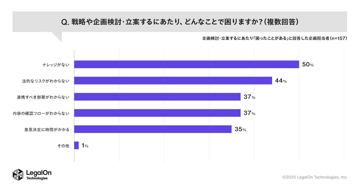 ・「戦略や企画検討・立案するにあたり、困ったことがある」と回答した事業部の企画担当者は6割超。具体的に困ったことは「ナレッジがない」(50%)、「法的なリスクがわからない」(44%)といった知識不足による回答が上位に。