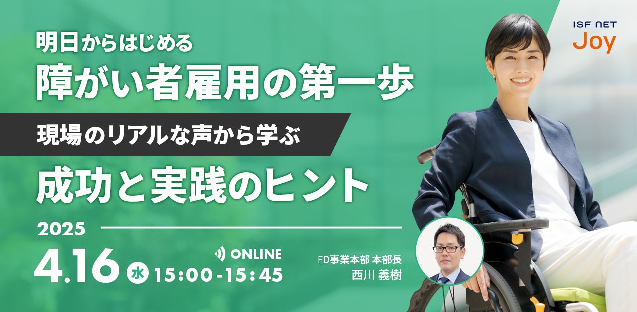 株式会社アイエスエフネットジョイ(本社:東京都新宿区、代表取締役:渡邉幸義、以下アイエスエフネットジョイ)は、2025年4月16日(水)の日程にて障がい者雇用ミニセミナー「明日からはじめる障がい者雇用の第一歩|現場のリアルな声から学ぶ成功と実践のヒント」を開催いたします。