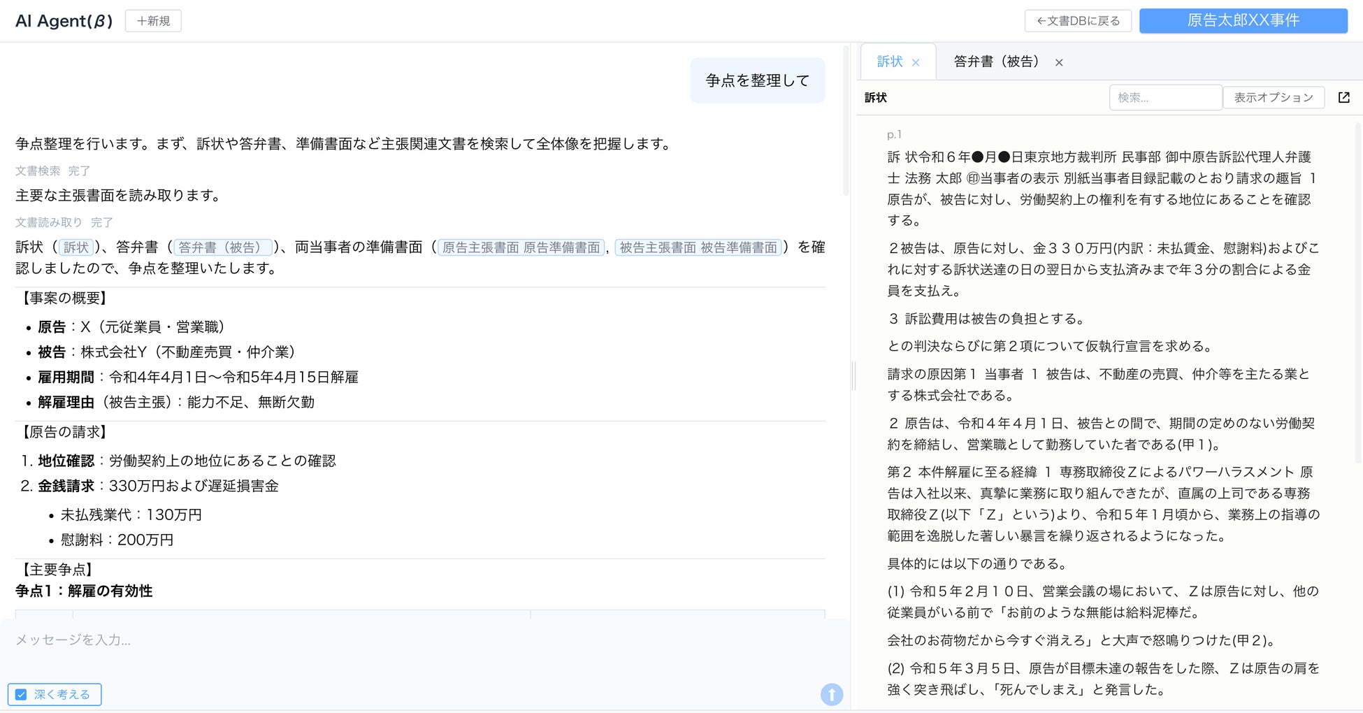 AIが人間の指示を柔軟に解釈し、『弁護革命』に保存された事件記録を自律的に検索、読み取って判断をおこない、応答します。単純な要約、資料探索にとどまらず、争点整理や証拠評価といった業務のコアに属する指示にもパフォーマンスを発揮します。