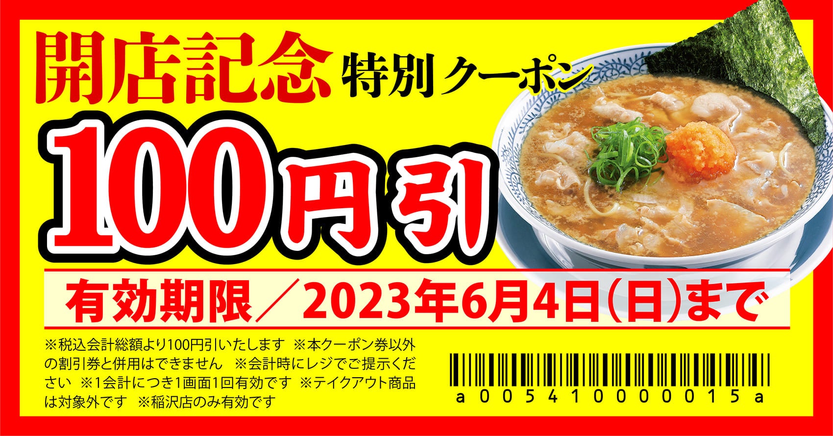 株式会社物語コーポレーション(本社:愛知県豊橋市/代表取締役社長:加藤 央之)が運営する『丸源ラーメン 稲沢店』は、2023年5⽉26日(金)にグランドオープンいたします。オープン記念として、2023年6月4日(日)まで『丸源ラーメン 稲沢店』のみでご利⽤いただける100円引クーポンを配布します。