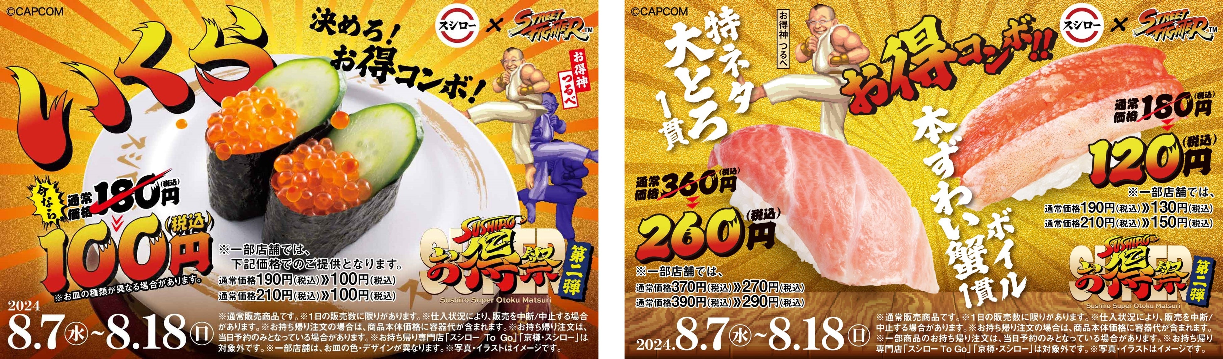 この度、おすしをお楽しみいただくことはもちろん、おすしと一緒に楽しめるコンテンツを提供したいとの想いから、大人気格闘ゲーム「ストリートファイター」とのコラボを7月24日(水)より実施しております。第二弾は、通常よりもお得に楽しめる商品を集めた『スシローSUPERお得祭 [第二弾]決めろ!お得コンボ!』を8月7日(水)より期間限定で開催いたします。
