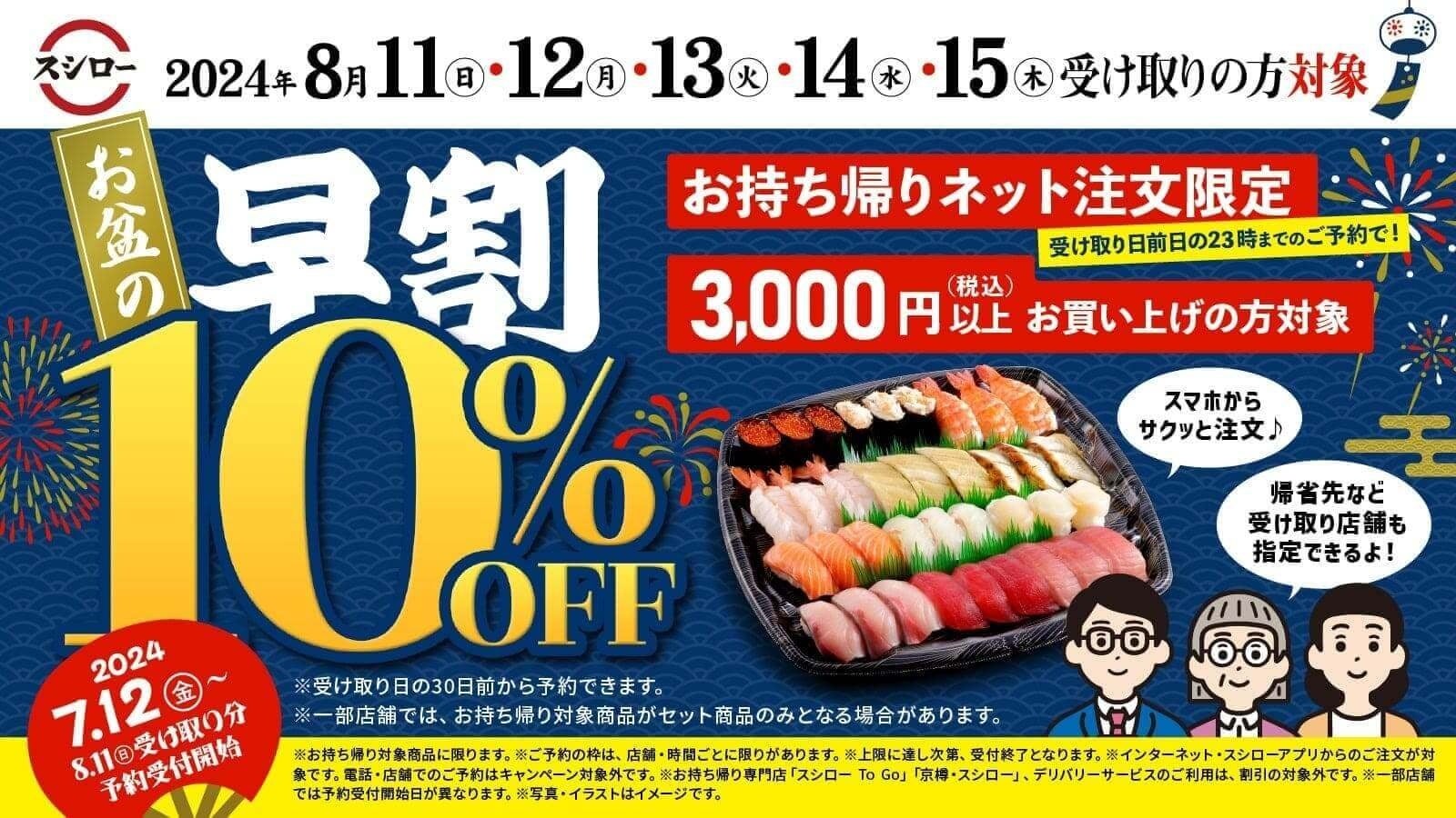 スシローでは、8月11日(日)~8月15日(木)受け取りの方を対象に、お持ち帰りネット注文限定で、受け取り日の前日23:00までのご予約、かつ3,000円(税込)以上をお買い上げの場合、早割10%OFFを実施いたします。