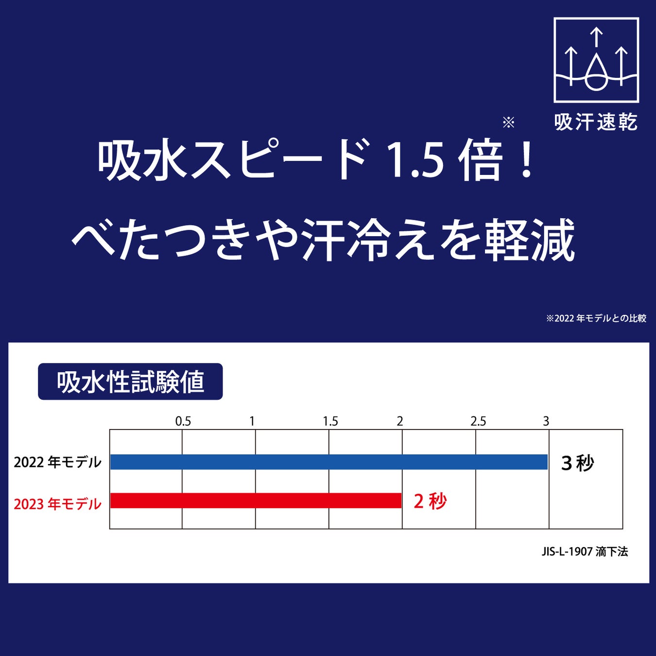 従来品より生地の厚みを抑え、ごわつかないので、動きやすく、重ね着もしやすくなりました。吸水性がアップし、素早く汗を吸収するので、べたつかず、汗冷えを軽減します。