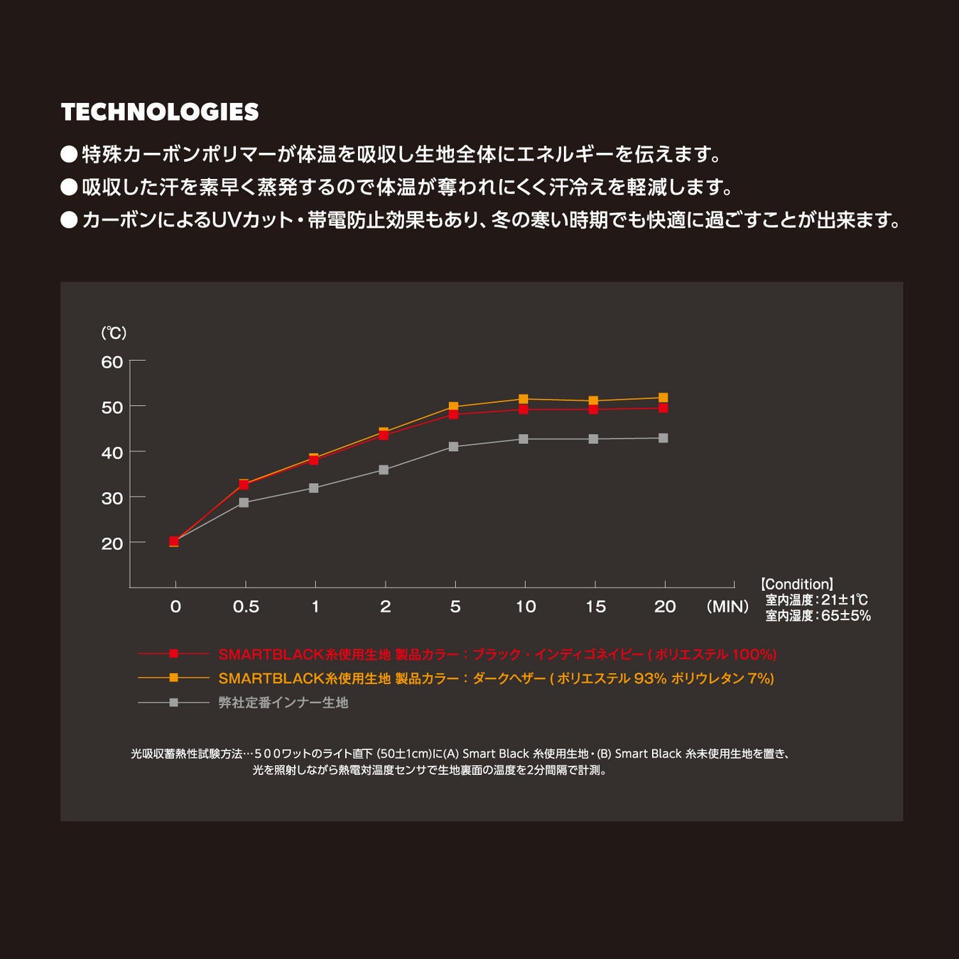 特殊カーボンポリマーが、体温を熱に変え、生地全体にエネルギーを伝導。光吸収蓄熱性試験では、ヒュンメル定番インナー生地と比較し、+7℃の蓄熱保温効果を確認。高い蓄熱保温性を発揮します。カーボンによる帯電防止効果で、冬の不快な静電気も軽減。またストレッチ性や吸汗速乾性も備え、快適な着心地です。