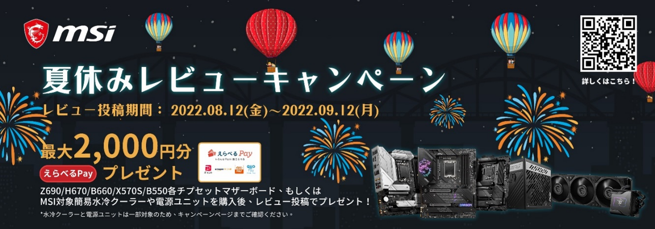 この度、エムエスアイコンピュータージャパン株式会社は、2022年8月12日(金)~9月12日(月)までの間、対象のZ690/H670/B660/X570S/B550チップセットを搭載したマザーボードと一部のMSI簡易水冷クーラーや電源ユニットを購入後、価格.comなどの指定サイトにレビューを投稿いただいた方全員に最大2,000円分のえらべるPayをプレゼントする「夏休みレビューキャンペーン2022」を開催いたします。キャンペーンURL:https://jp.msi.com/Promotion/JP_Review-campaign